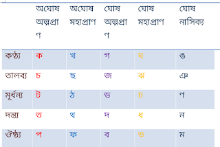 উচ্চারণ স্থান অনুসারে ব্যঞ্জনের শ্রেণিবিভাগ: